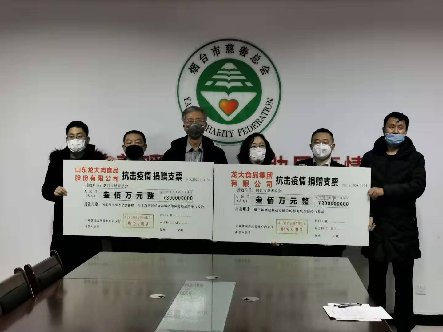 连日来,新型冠状病毒感染的肺炎疫情牵动了全国人民的心。为响应党中央决策部署、支持疫情防控和救治,乐竞和山东龙大肉食品股份有限公司积极奉献爱心、践行企业社会责任,于1月31日各向烟台市慈善总会捐款300万元、共计600万元,其中向烟台市慈善总会捐赠300万元,向莱阳市慈善总会捐赠300万元,主要用于新型冠状病毒感染的肺炎疫情防控。