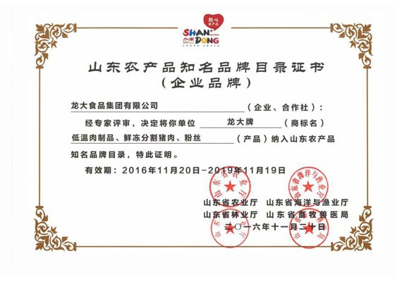11月20日,山东省农业厅、海洋与渔业厅、林业厅、畜牧兽医局联合公布了《山东省首批知名农产品区域公用品牌和企业产品品牌名单》,乐竞生产的龙大牌低温肉制品、龙大牌鲜冻分割猪肉和龙大牌粉丝三个产品入选《山东省首批知名农产品企业品牌目录》。