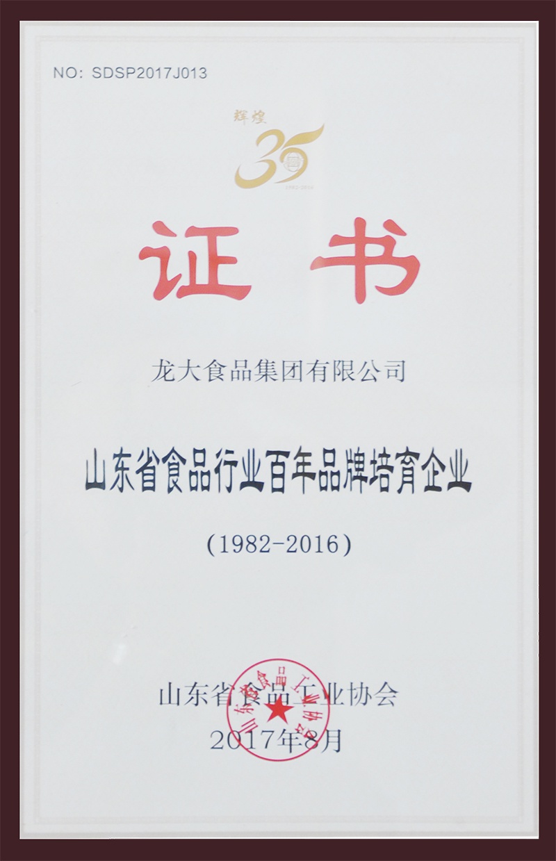 9月7日,山东省食品工业协会“辉煌35周年第八次会员代表大会暨产学研合作推动食品工业转型升级高峰论坛”在济南召开,龙大集团被授予“山东省食品行业百年品牌培育企业”荣誉称号。