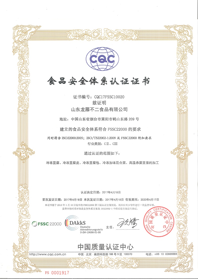 日前,山东龙藤不二食品有限公司获得由中国质量认证中心颁发的《食品安全体系认证证书》。这一证书的颁发,意味着龙藤不二公司的食品安全管理水平正式与国际高标准的食品安全管理水平接轨。